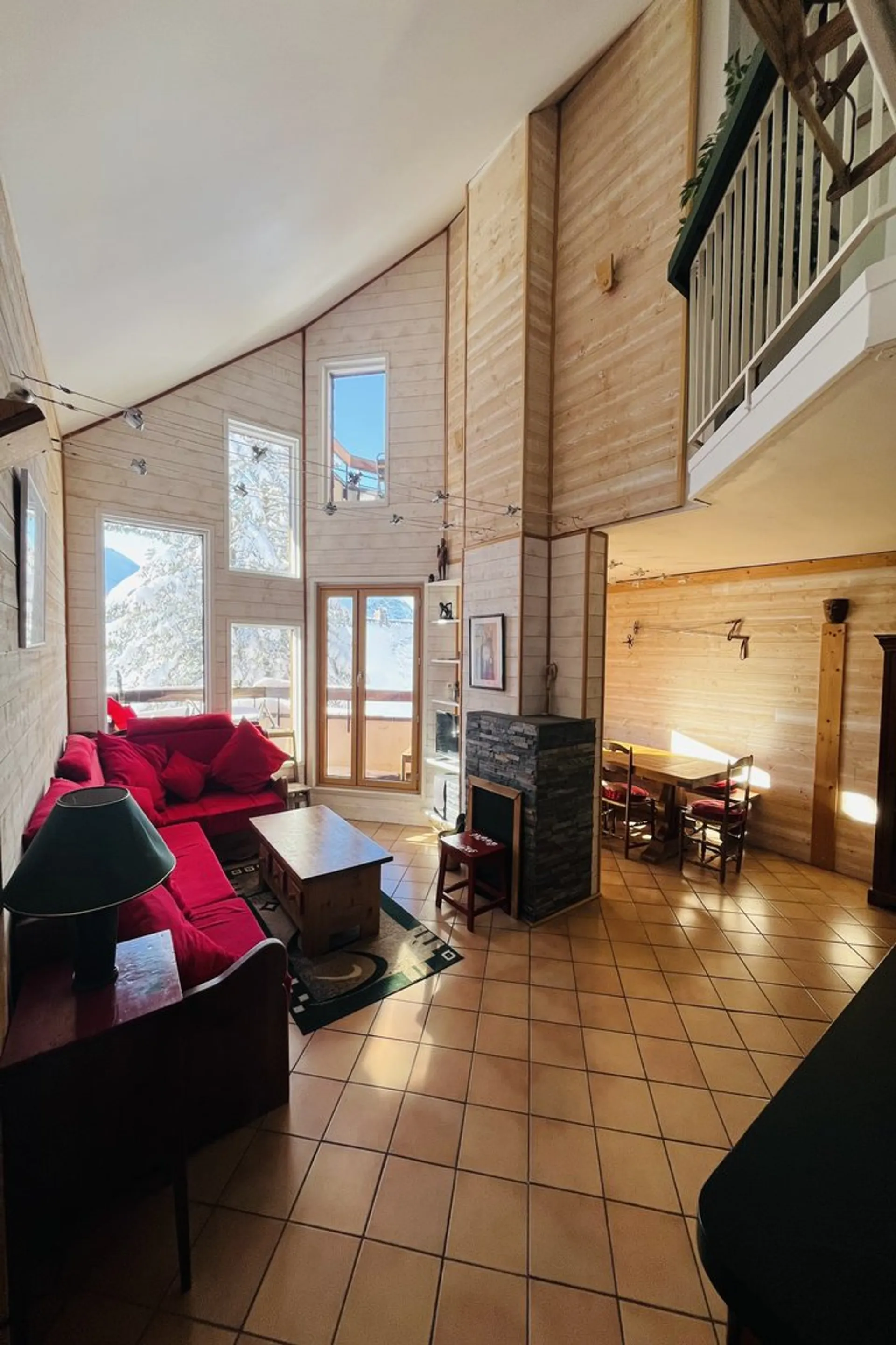 Experience the warmth of a rustic mountain retreat with this inviting open-concept living space, featuring a plush red sofa, a sleek black bar, and a welcoming dining area, all bathed in natural light