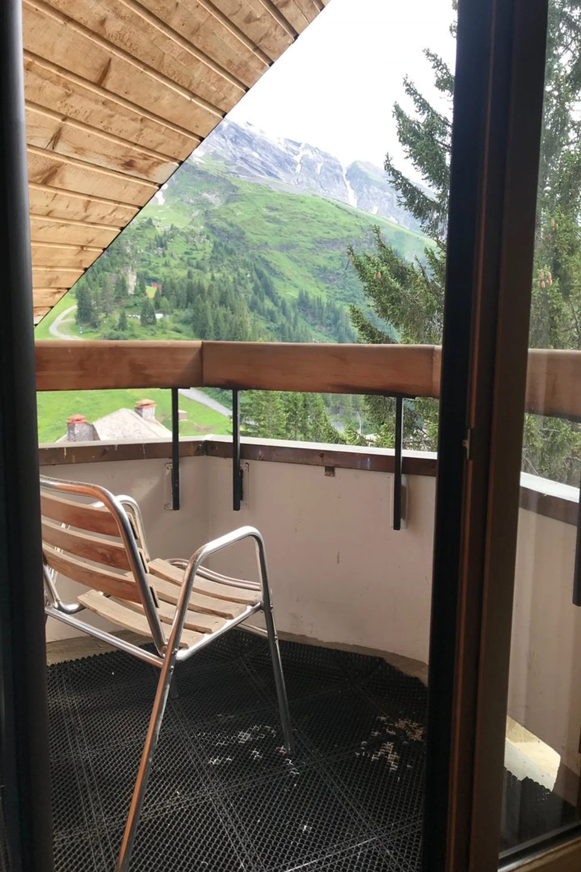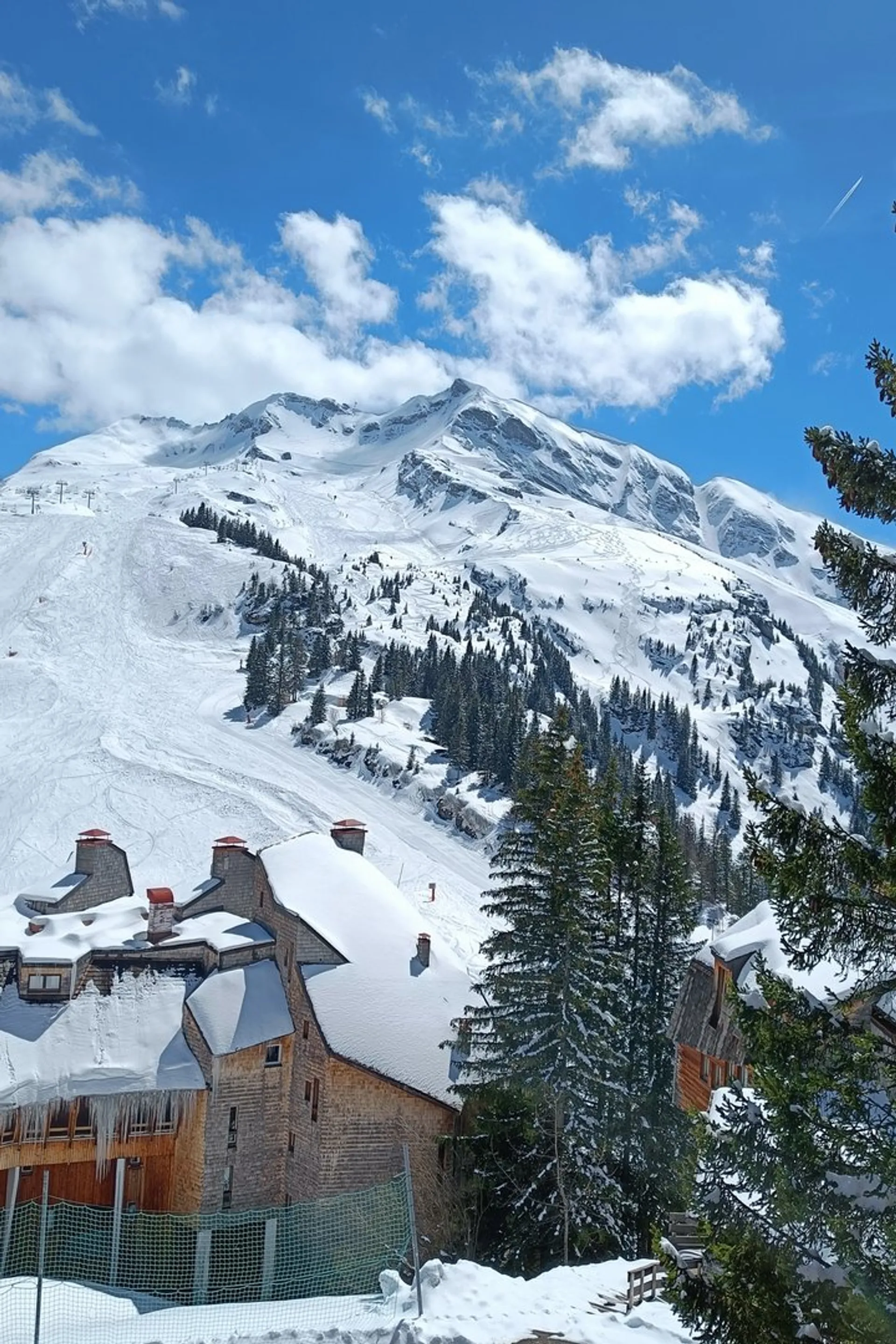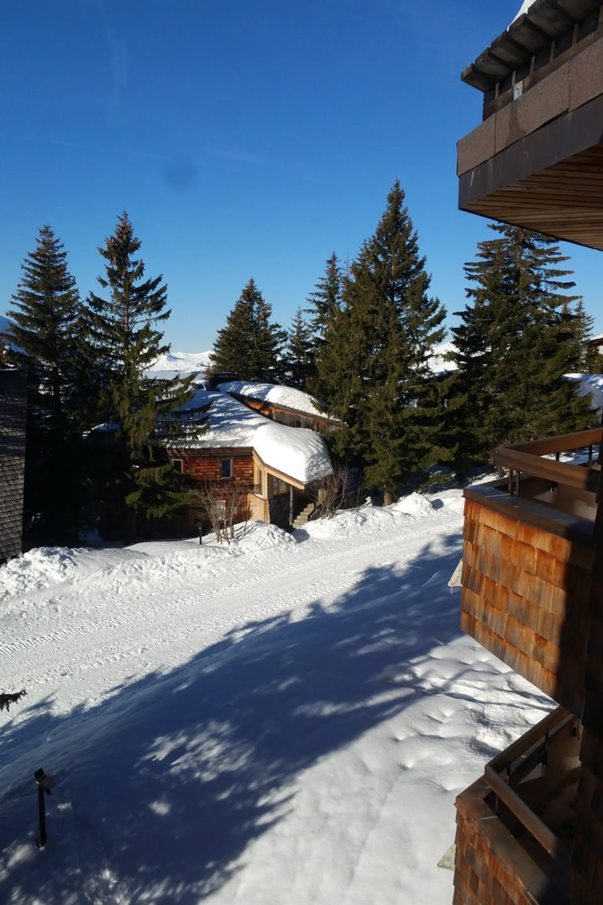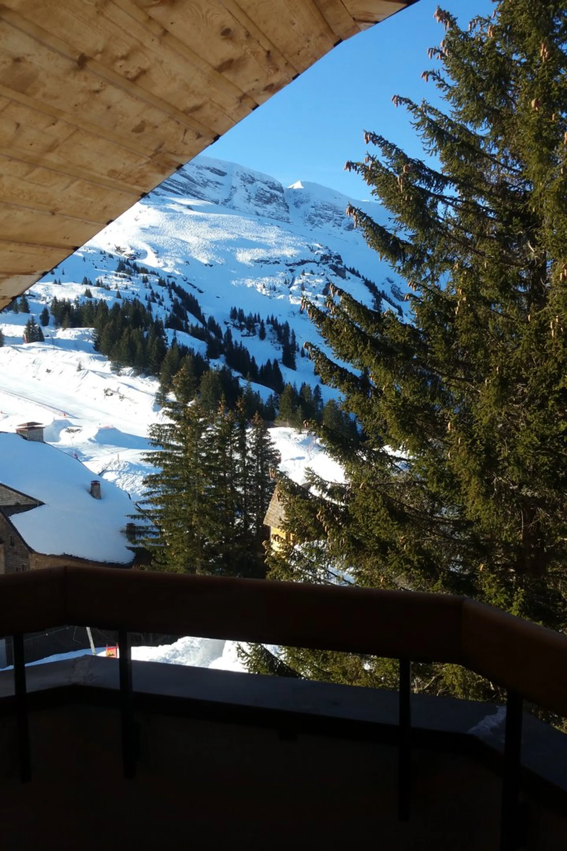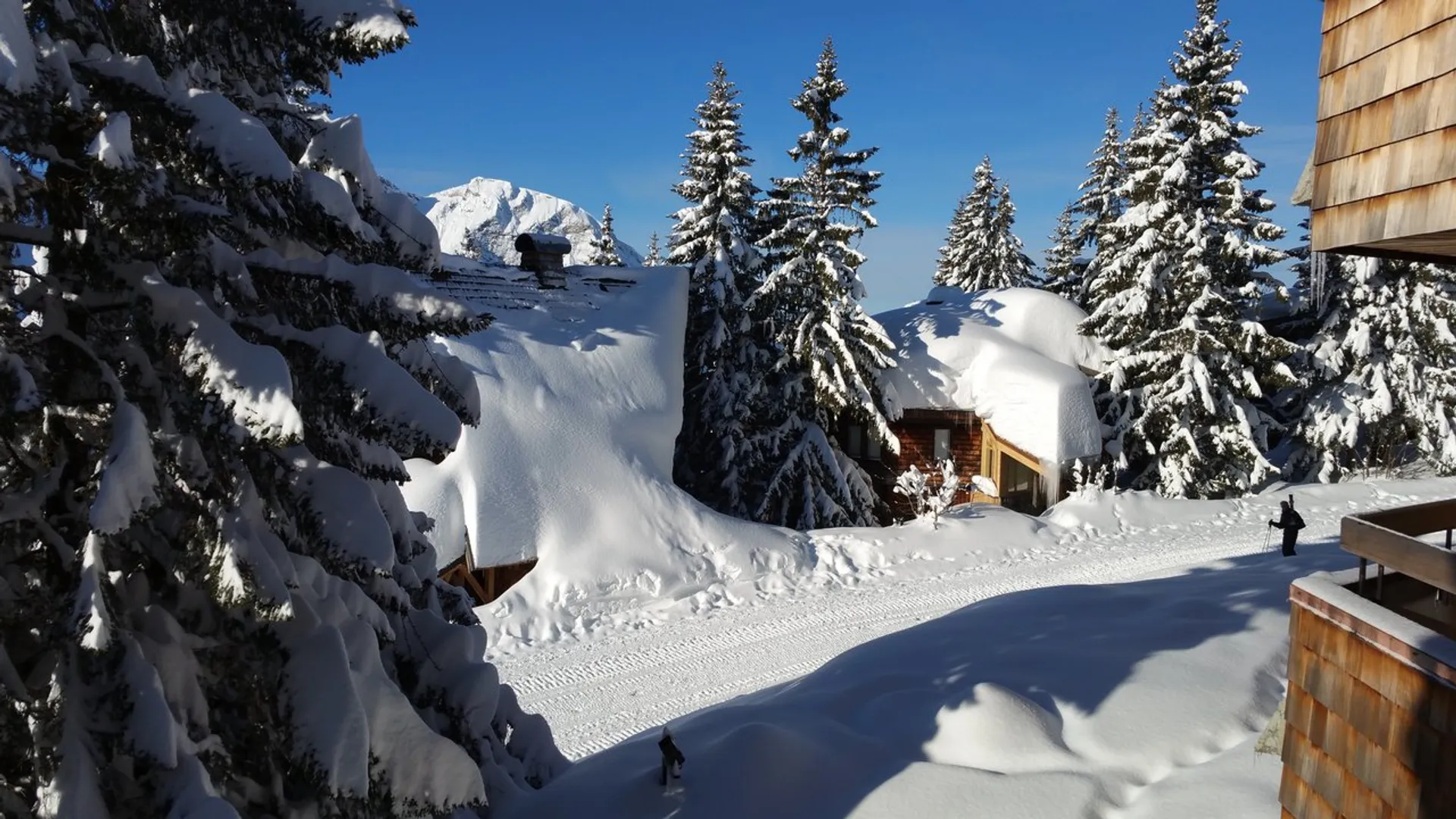 Embrace the serene beauty of a winter wonderland from the comfort of your own balcony, surrounded by the majestic snow-covered peaks and tranquil forest of this alpine retreat
