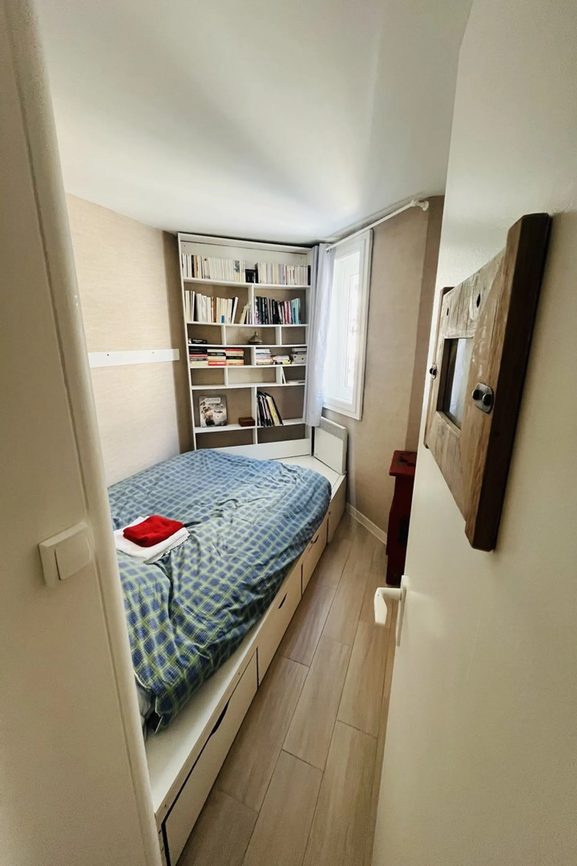 Discover the serene simplicity of this stylish bedroom, featuring a comfortable bed, a built-in bookshelf, and a touch of vintage charm