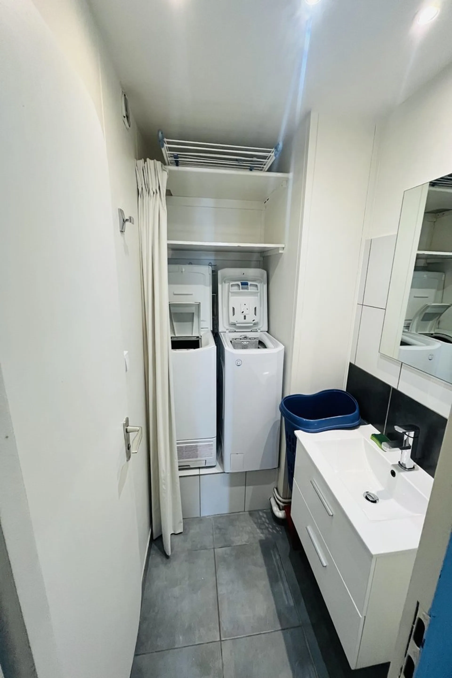 A compact yet functional bathroom space, featuring essential appliances and modern design
