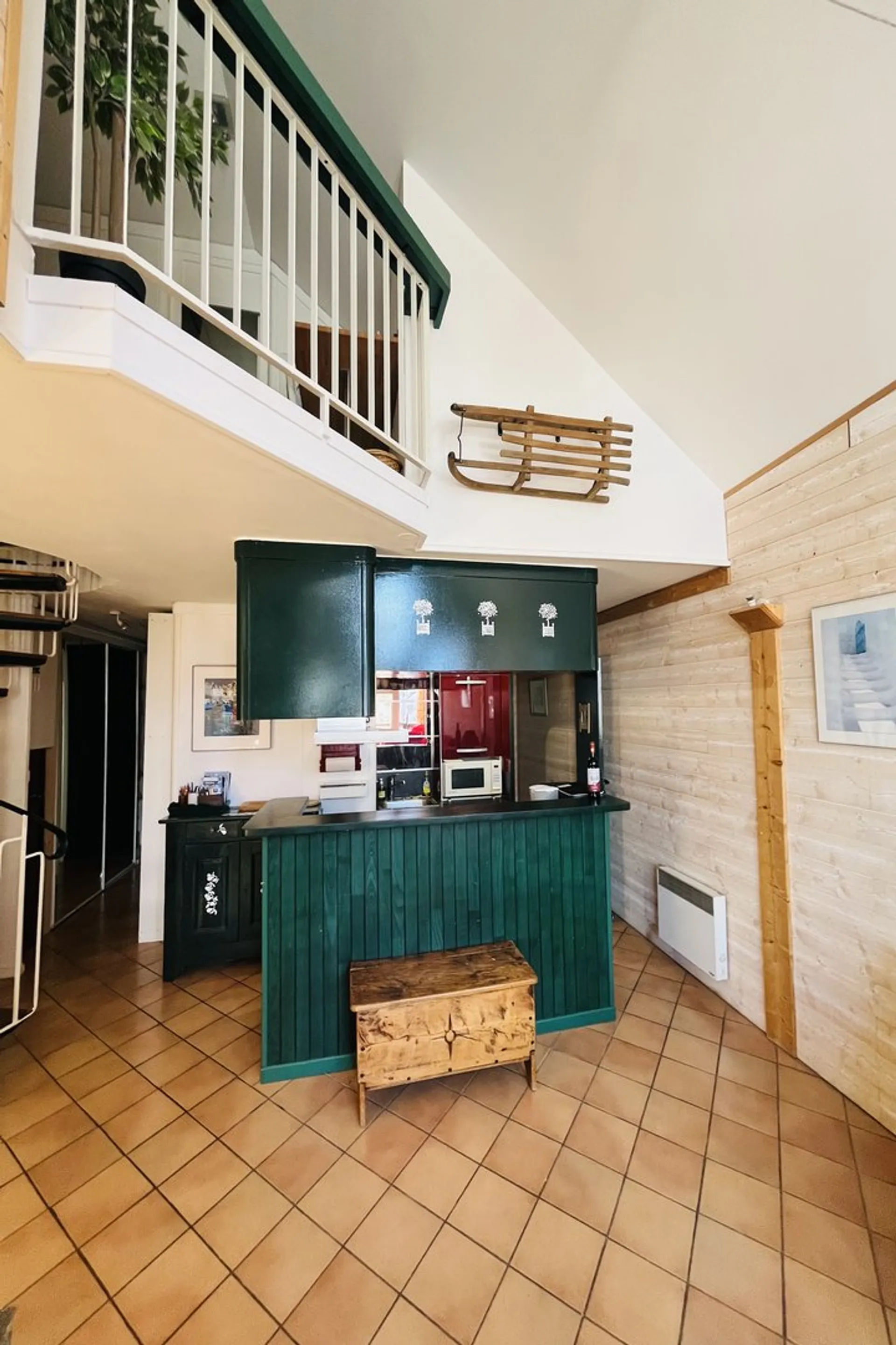 Experience rustic charm in a quaint appartement with this inviting interior featuring a charming green bar, warm wooden accents, and a welcoming atmosphere