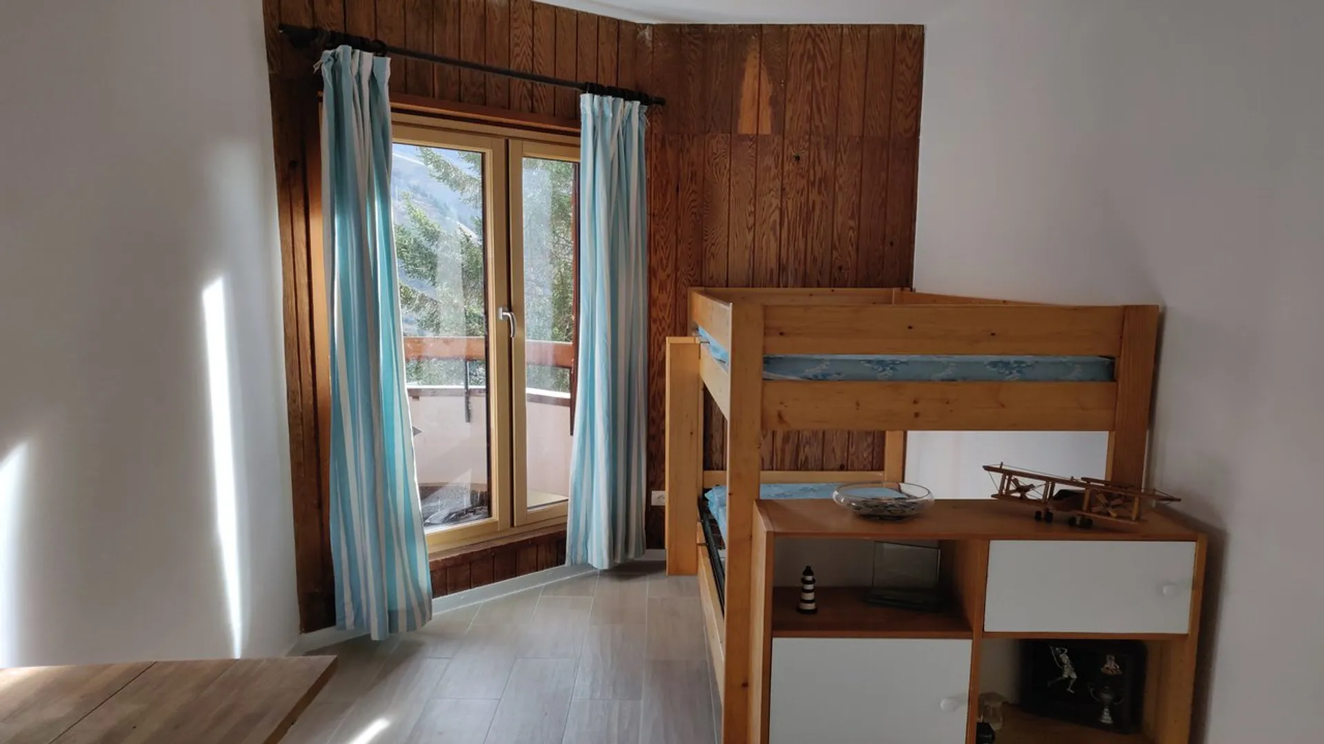 Embrace the serene mountain view from your private balcony in this inviting, wood-paneled bedroom featuring a bunk bed, perfect for your next alpine retreat